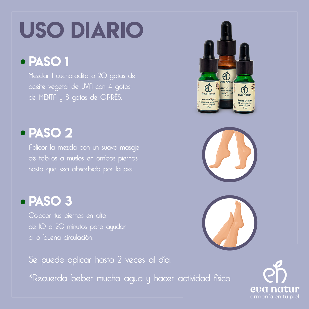 - Aplicar la mezcla con un suave masaje en sentido ascendente (de tobillos hacia muslos), en ambas piernas hasta que sea absorbida por la piel.